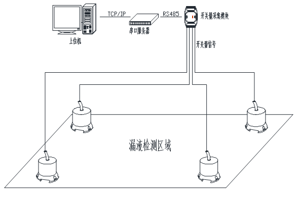 YCH-SMDT傳感器安裝于漏液監(jiān)測(cè)區(qū)域,當(dāng)檢測(cè)到液體泄漏時(shí),通過(guò)開(kāi)關(guān)量采集模塊上傳泄漏數(shù)據(jù)至監(jiān)控平臺(tái),實(shí)現(xiàn)實(shí)時(shí)集中監(jiān)控。傳感器輸出的開(kāi)關(guān)量信號(hào)也可用來(lái)控制外圍設(shè)備如聲光報(bào)警器、短信模塊、開(kāi)關(guān)量采集模塊等。