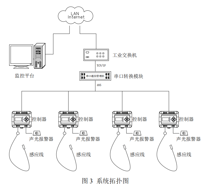 控制器與感應線連接,感應線安裝于漏液檢測區域,當發生液體泄漏時,觸發控制器報警及繼電器動作,通過 RS485 信號上傳泄漏數據至監控平臺,精準定位,實現實時集中監控??刂破骼^電器輸出信號可聯動控制外圍設備如聲光報警器、自動閥門與智能報警等設備。